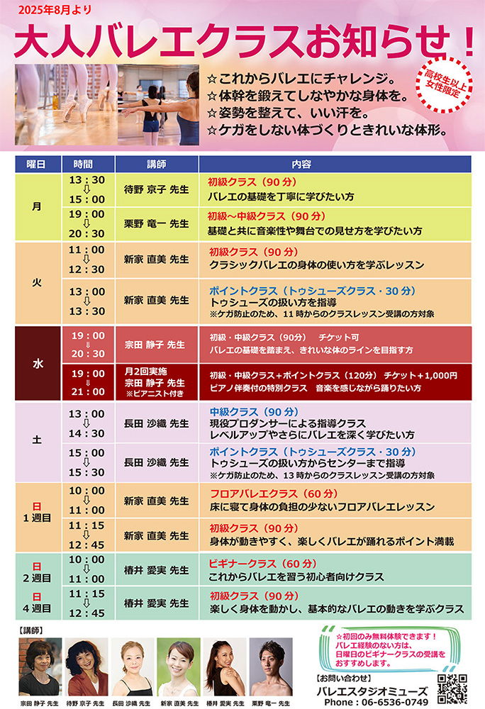 バレエスタジオ ミューズでは、プロのダンサーを中心とした『オープンクラス』などをはじめ、高校生から成人女性を対象とした『大人バレエクラス』など、経験やご要望に応じたクラスを複数設けております。