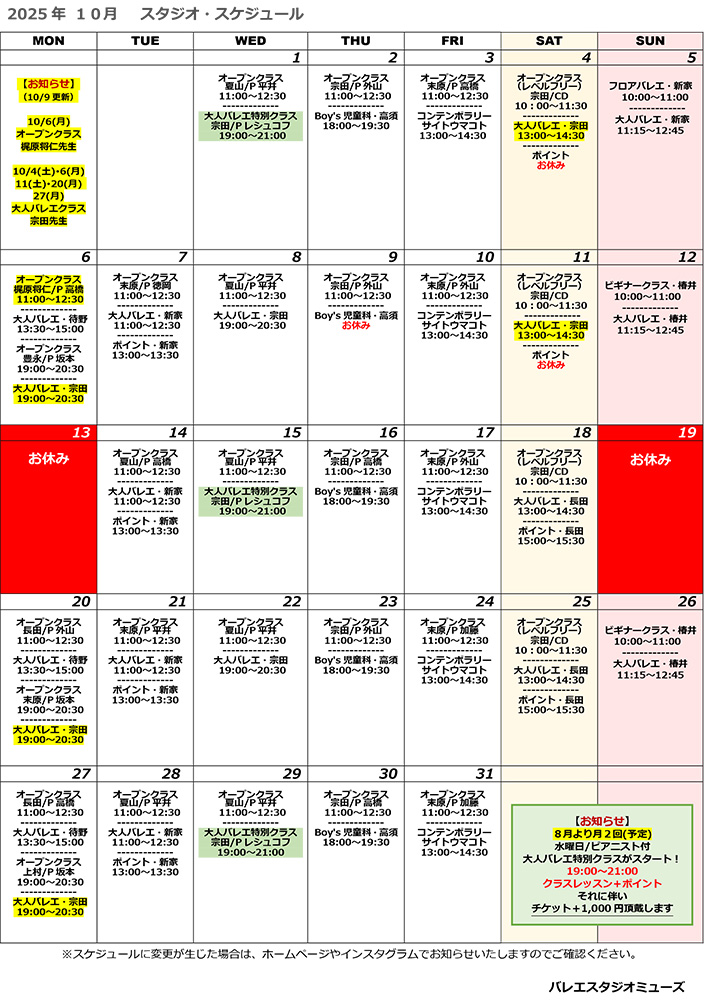 2025.09.27 バレエスタジオ ミューズ 10月のスケジュール(10月9日更新) バレエスタジオ ミューズ 2025年10月のスケジュール (10月9日更新) クリックしてPDFを表示 Share バレエスタジオ ミューズ 9月のスケジュール